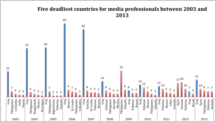 More than 36% of all the cases of killed media professionals worldwide between 2003 and 2013 occurred in Iraq. It is the deadliest country for media professionals.