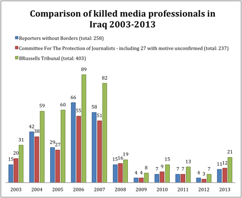 In 2013, the BRussells Tribunal has listed 21 assassinated media professionals, while the two best known advocacy groups for journalists: the Committee For The Protection of Journalists (CPJ) and Reporters Without Borders (RSF) listed respectively 12 and 11 murdered Iraqi colleagues.