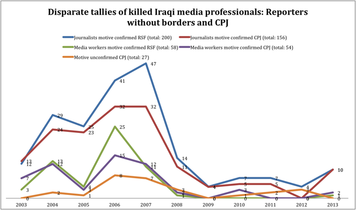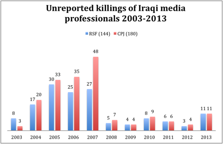 It is hard to imagine that the unreported killing of 144 Iraqi media professionals (RSF) and 180 Iraqi media professionals (CPJ) between 2003 and 2013 was not related to their work.